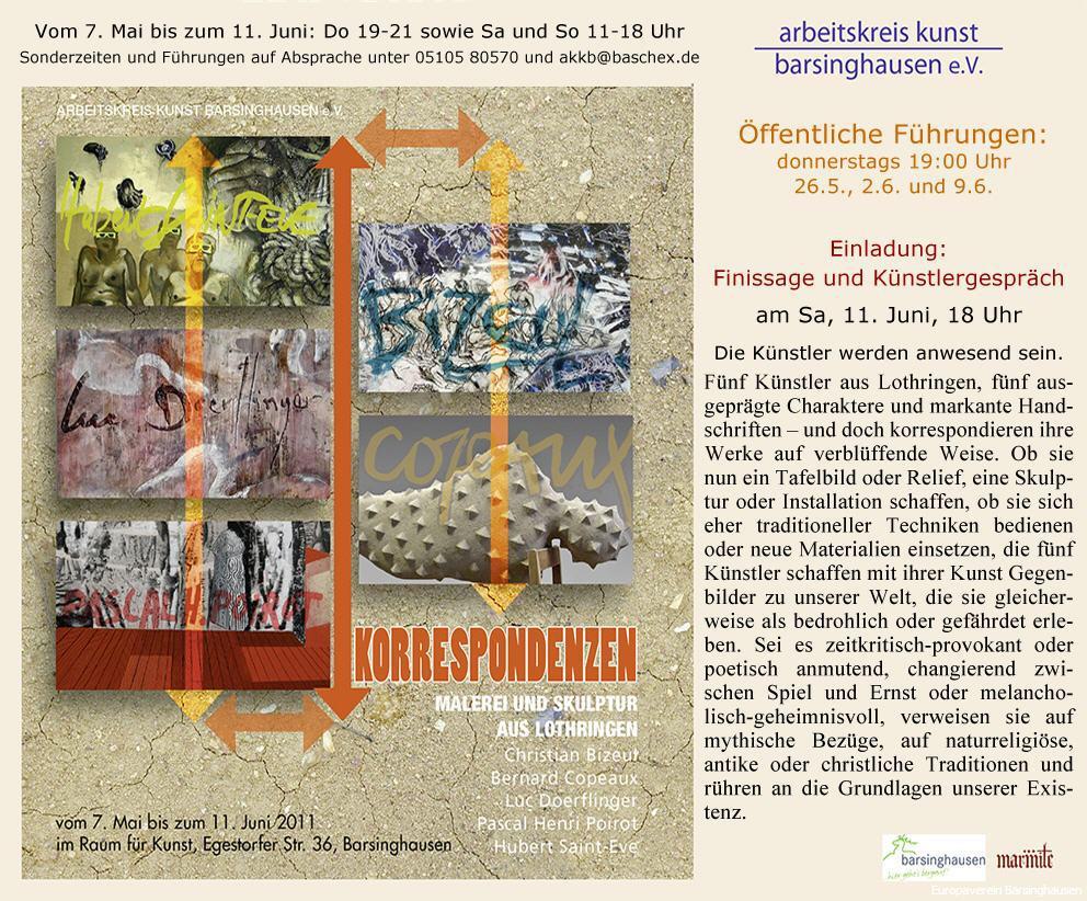 Die Künstler Christian Bizeut, Bernard Copeaux, Luc Doerflinger, Pascal Herni Poirot und Hubert Saint-Eve präsentieren noch bis zum 11. Juni 2011 einen Ausschnitt aus ihren Werken im Raum für Kunst in Barsinghausen. Jeweils donnerstags von 19:00 - 21:00 Uhr und samstags und sonntags von 11:00 - 18:00 Uhr kann die Ausstellung besucht werden.