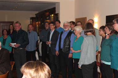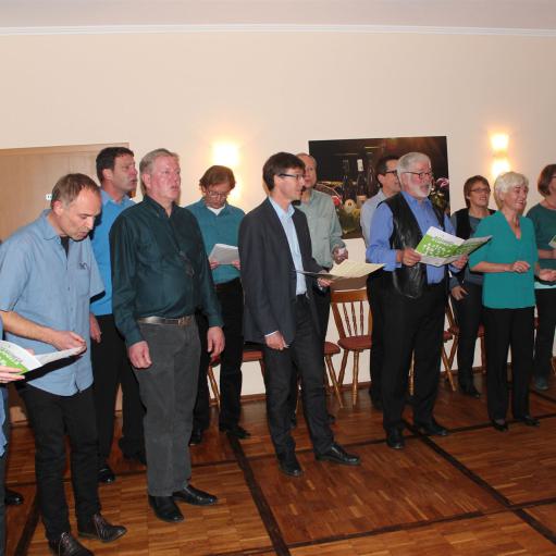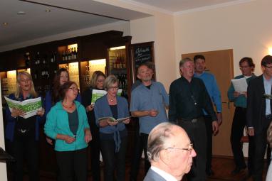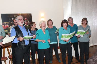 Vor dem Dessert wurde ein ganz besonderer Gang eingeschoben, denn zwischenzeitlich hatte sich der eingeladene Chor "Vocal Venture" versammelt, um aus seinem Repertoire einige Lieder vorzutragen. Dabei zeigte sich die ganze Vielfalt des Chores von jazzigen Stücken über Klassiker bis zu Interpretationen von Rockballaden der Gruppe Queen. Erst nach einer Zugabe wurde der Chor dann unter großem Applaus des Publikums verabschiedet.