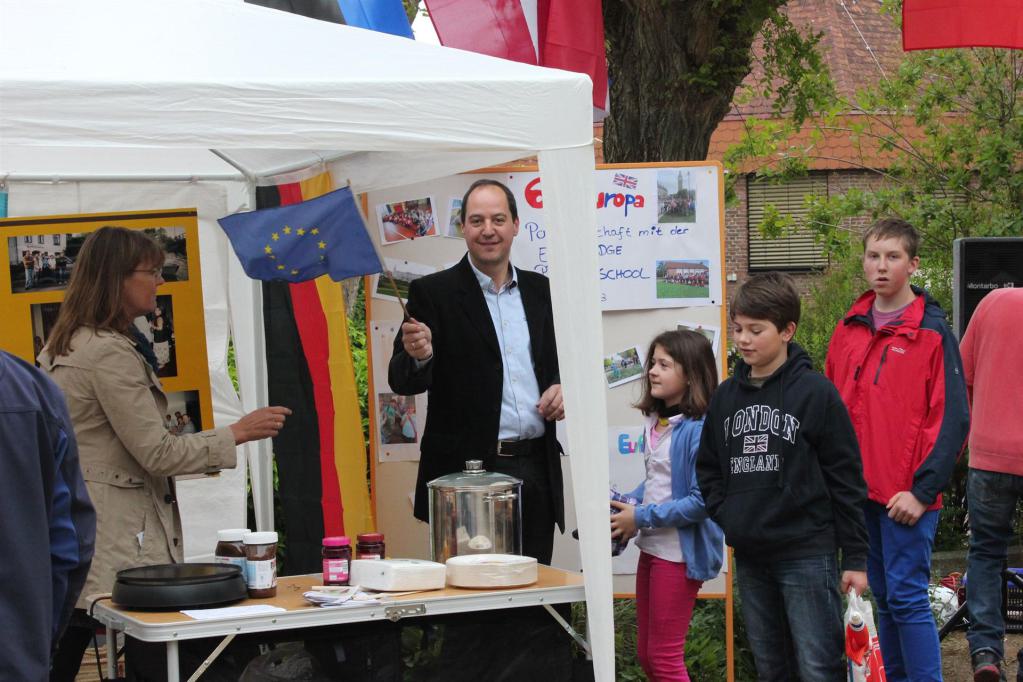 Pünktlich morgens um 10:00 Uhr waren die einzelnen Stände aufgebaut und die Crêpesplatte angeheizt. Die Besucher können kommen. Der Europaverein hat seine Arbeit in einem Pavillon vorgestellt und Schülerinnen und Schüler der Klasse 6 "Europa" von der Goetheschule KGS Barsinghausen boten bei uns ein Flaggenmemory aller europäischen Flaggen und Fingernageldesign mit Europas Flaggen.