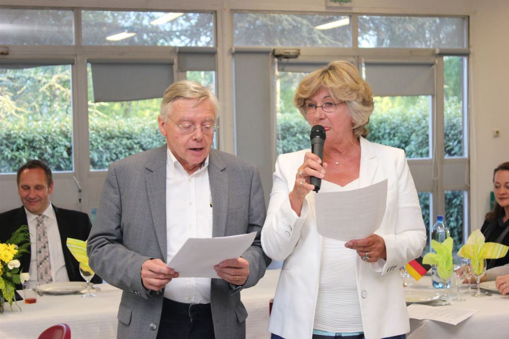 In Ihrem Grußwort ging sie auf die Bedeutung der europäischen Union ein, insbesondere mit Blick auf die aktuellen Krisen die in dieser bestehen. Ganz besonders freut sie sich, dass die Partnerschaft zwischen unseren beiden Städten im nächsten Jahr „Goldene Hochzeit“ feiert, denn im Jahr 2016 wird diese Partnerschaft 50 Jahre lang bestehen. Es wird sicher ein besonderes Treffen nächstes Jahr mit einer besonderen Feier, die wir sogar zweimal feiern, denn auch bei der nächsten Fahrt nach Mont-Saint-Aignan wird dieses Jubiläum eine besondere Rolle spielen.