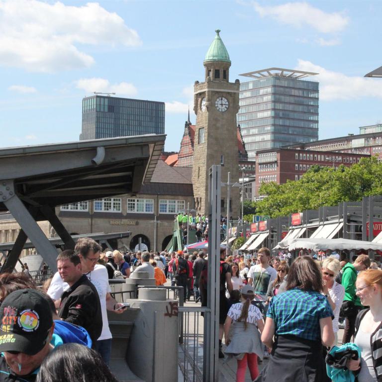 Abschließend ließen wir uns in einem Biergarten direkt auf den Landungsbrücken nieder, um bei herrlichem Sonnenschein und Kaltgetränken, dem Treiben rundum und auf der Elbe zuzuschauen. Wir kamen schnell mit einem Hamburger ins Gespräch der uns spontan seine Fahrkarte lieh, als er mitbekam, dass eines der Kinder unserer Gäste gern mal mit einem Schiff gefahren wäre. So setzten einige noch mal schnell mit der Fähre wenigstens einmal über die Elbe und zurück.