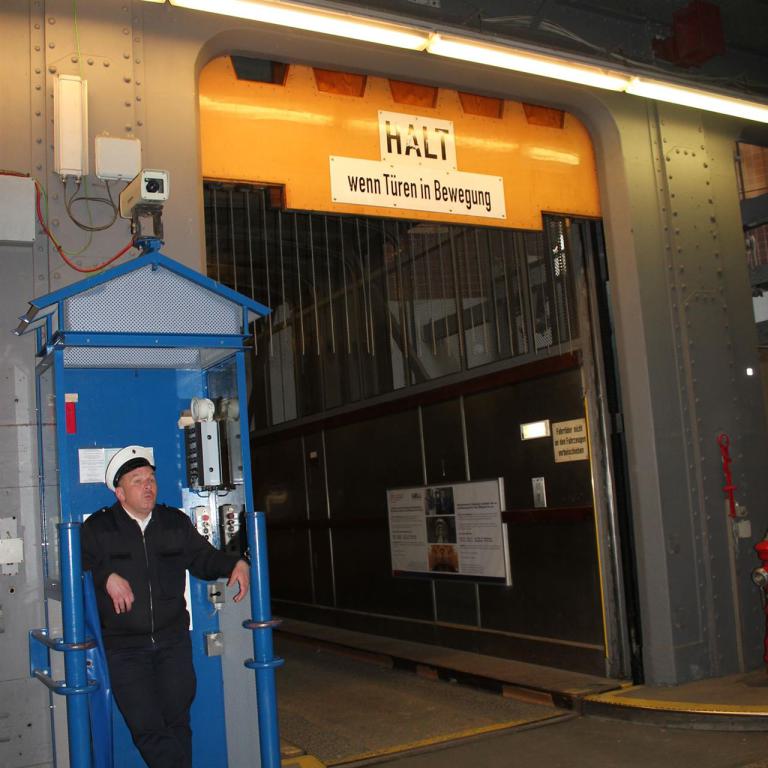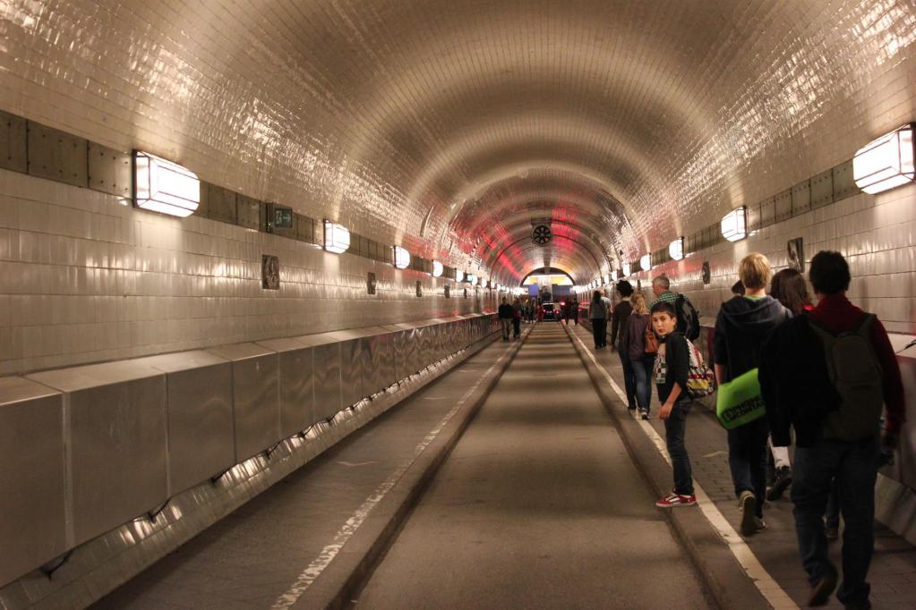Wir nutzten den nahen Einstieg in den alten Elbtunnel und gingen zu Fuß unter die Elbe. Den Abstieg machten wir über das gewaltige Treppenhaus vor den Fahrstühlen. Für den Aufstieg nutzten wir dann aber einen der großen Lastenfahrstühle, mit denen auch die Autos transportiert werden, um die Elbe zu unterfahren.