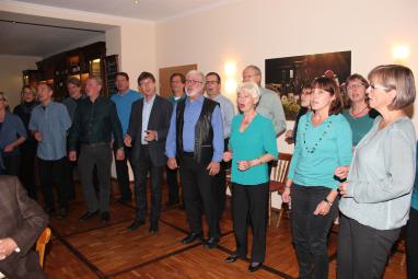 Vor dem Dessert wurde ein ganz besonderer Gang eingeschoben, denn zwischenzeitlich hatte sich der eingeladene Chor "Vocal Venture" versammelt, um aus seinem Repertoire einige Lieder vorzutragen. Dabei zeigte sich die ganze Vielfalt des Chores von jazzigen Stücken über Klassiker bis zu Interpretationen von Rockballaden der Gruppe Queen. Erst nach einer Zugabe wurde der Chor dann unter großem Applaus des Publikums verabschiedet.